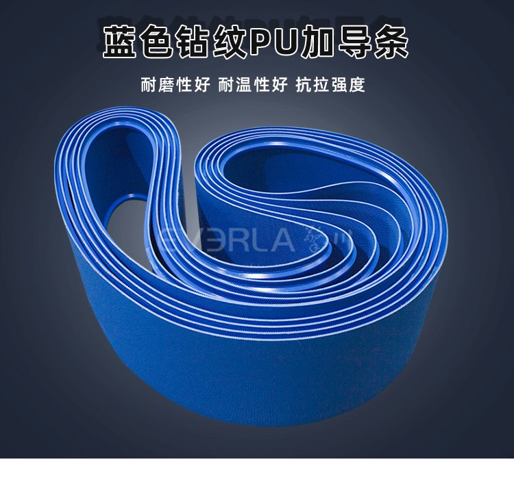 為食品、醫(yī)藥、包裝、日化提供一站式特殊定制糖果加工輸送配件:藍色PU鉆紋輸送帶導條應(yīng)用